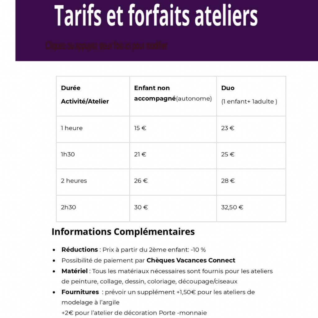 - Annulation possible jusqu’à 48h avant l’atelier
