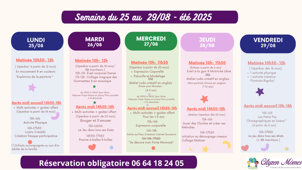 🌟 Ateliers enfants Levallois-Planning de la semaine du 25 au 29 août 2025