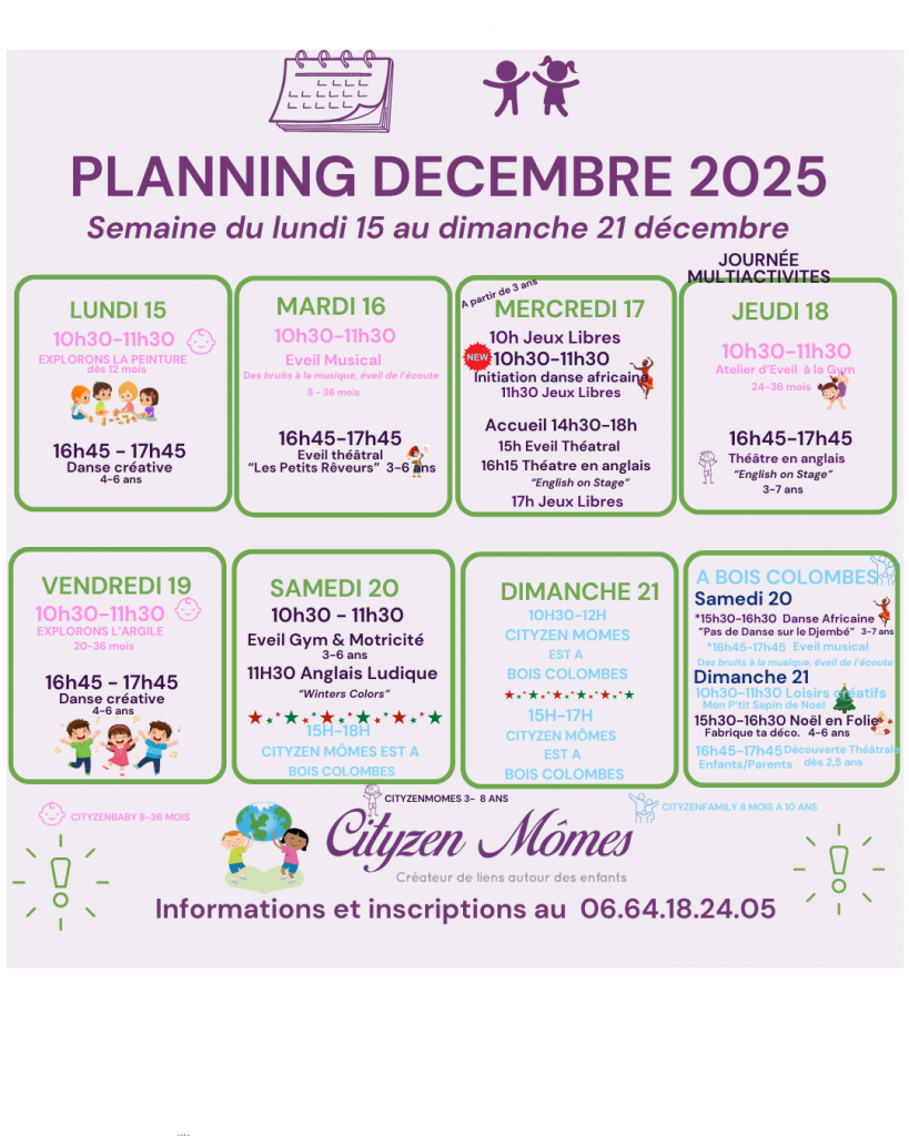 - 🎯 Publics : enfants dès 9 mois jusqu’à 7 ans, avec ou sans accompagnement adulte. (Cityzen Mômes)